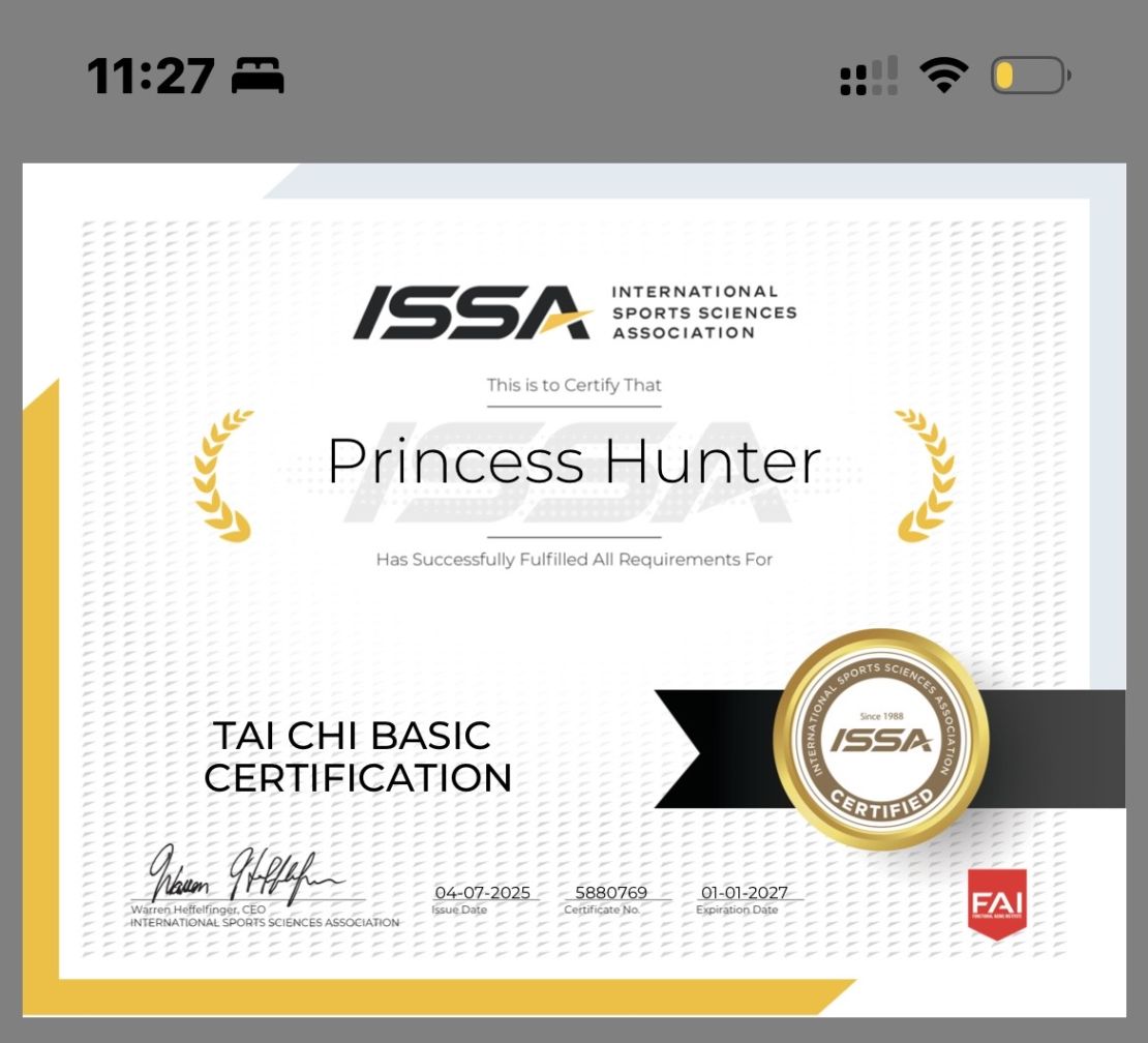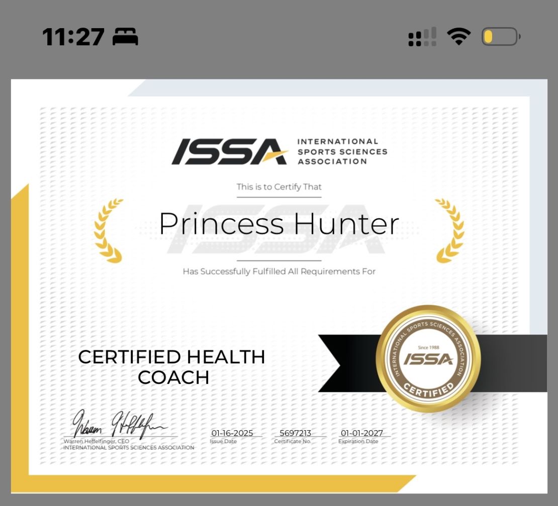 Health coaching is a calling. As a certified Health Coach, I help clients take control of their well-being by creating sustainable lifestyle changes that support long-term health. From stress management and nutrition to fitness and behavior change, I guide people toward healthier habits that transform lives. In a world facing rising rates of chronic illness, I'm equipped to be part of the solution—offering support, education, and accountability when it matters most. With this certification, I don't just coach—I empower lasting change.